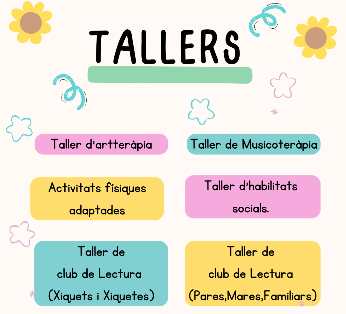 Els nostres tallers oferixen un espai inclusiu, creatiu i enriquidor per a infants i joves amb diversitat funcional. A través de propostes com l’art, la música, la lectura, el moviment i les habilitats socials, fomentem l’expressió, la relació amb els altres i el desenvolupament personal. Cada activitat està pensada per potenciar les capacitats de cada persona, en un entorn segur, lúdic i ple de possibilitats.